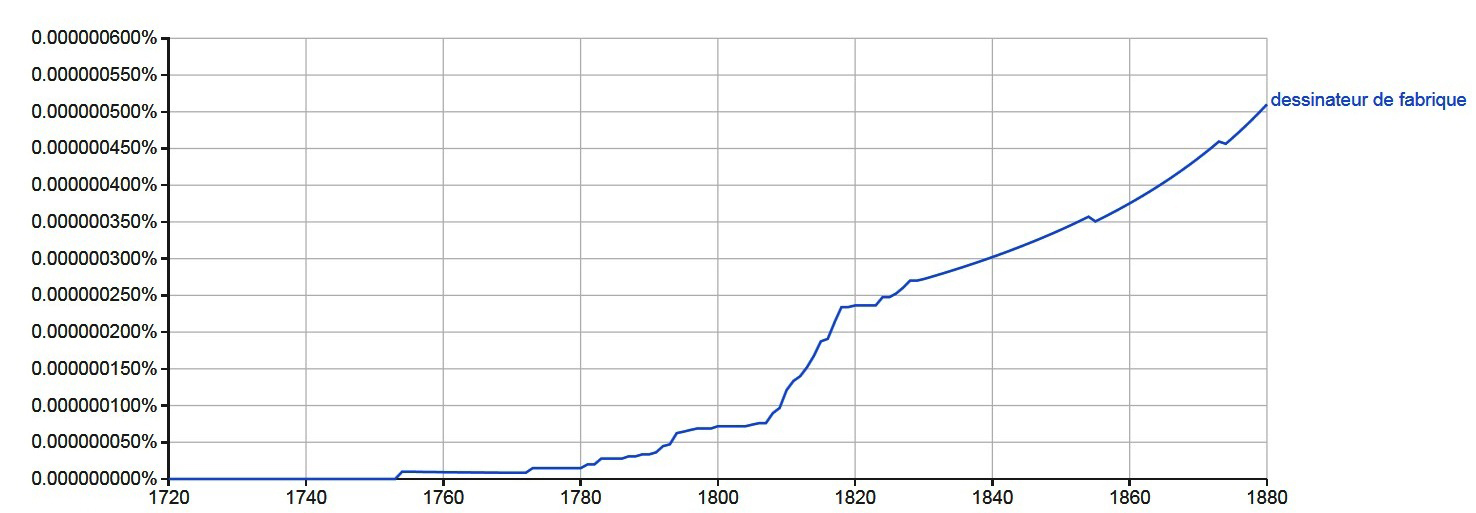 The term dessinateur de fabrique prevailed from the mid-eighteenth until the late nineteenth century, but it did not supplant all other denominations. Its increasingly widespread use in that period is confirmed by Google's textual analysis tool Ngram Viewer [https://books.google.com/ngrams], which can search for occurrences of a word or group of words in all Google Books. Ngram Viewer has many flaws and should not replace the analysis of quantitative and qualitative sources. However, by inventorying some 45 billion words in a corpus of 5.2 million French-language books, it allows for a completely unprecedented change of scale. Between 1720 and 1880, dessinateur de fabrique appeared in 136 books and articles. In the eighteenth century, dessinateur de fabrique was used very little in the specialized literature. An inverse trend is then observed: the term was used increasingly frequently throughout the nineteenth century