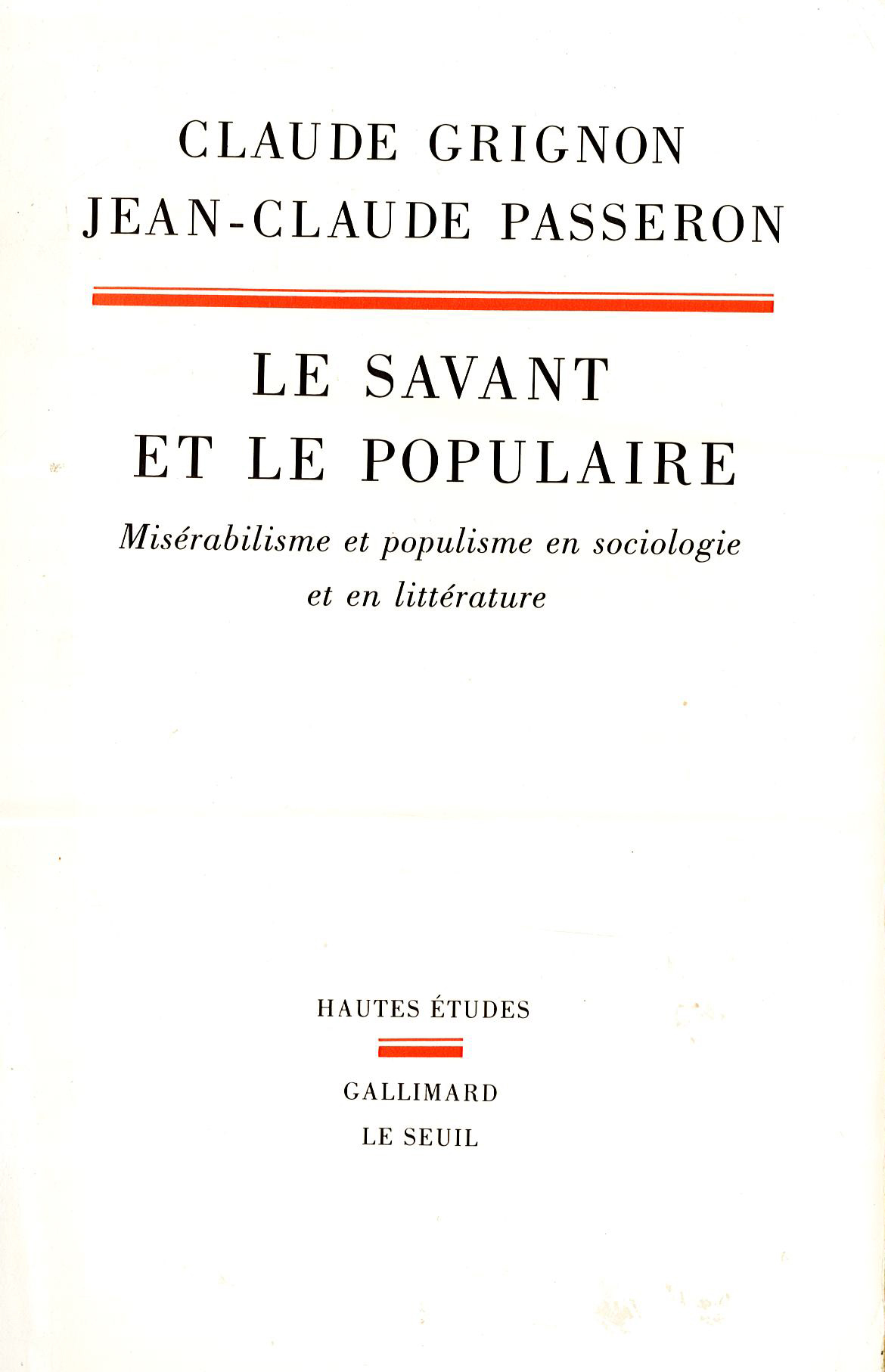 Grignon Claude & Passeron Jean-Claude (2015) [1989]. Le Savant et le Populaire. Misérabilisme et populisme en sociologie et en littérature. Paris, Seuil, « Points » [1re éd. Gallimard/Seuil, « Hautes études »]. En espagnol : Grignon Claude & Passeron Jean-Claude (1991). Lo culto y lo popular : miserabilismo y populismo en sociologia y en literatura. Traduction de María Sonderéguer. Buenos Aires, Ediciones Nueva Vision ; Grignon Claude & Passeron Jean-Claude (1992). Lo culto y lo popular : miserabilismo y populismo en sociologia y en literatura. Traduction de Fernando Alvarez-Uria et Julia Varela. Madrid, Las Ediciones de La Piqueta.