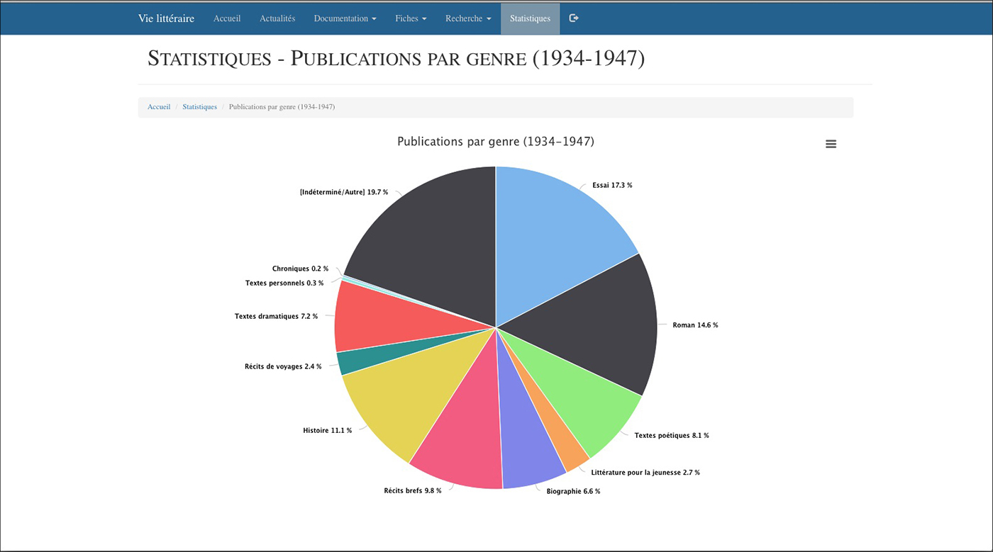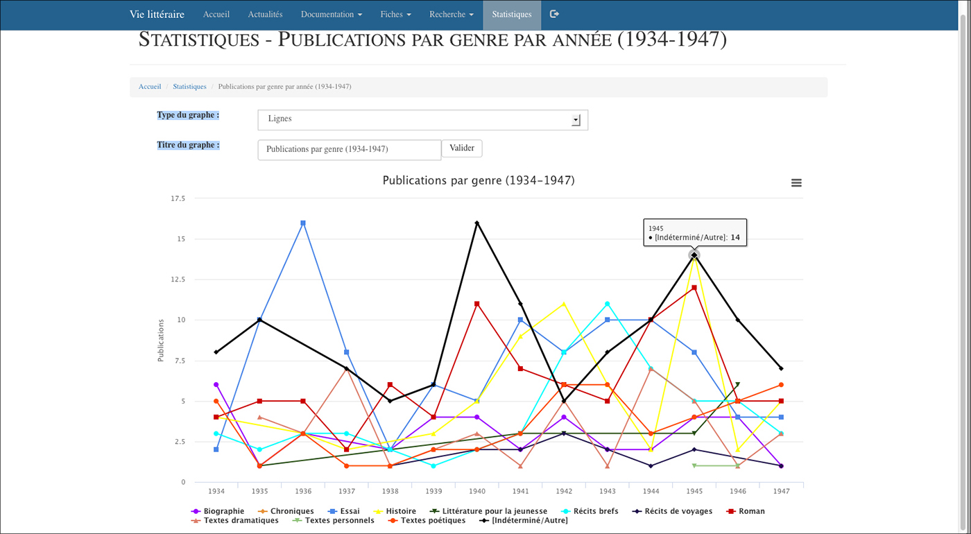 Si les fiches « Acteurs » demeurent les fiches les plus détaillées et les plus complexes de notre base, des fiches d’autres types y sont désormais intégrées. Les fiches « Œuvres » contiennent les références bibliographiques des quelque 3 000 œuvres – recensées à partir des catalogues de différentes bibliothèques et du Dictionnaire des œuvres littéraires du Québec (DOLQ) – grâce auxquelles chacun des collaborateurs entame son travail de sélection en vue de la rédaction de son ou de ses chapitres. Les fiches « Œuvres » permettent également de produire les tableaux statistiques (sur les nouveautés littéraires, les pourcentages de publications par genre, etc.) publiés dans le chapitre 4 (consacré au marché de la littérature) de nos tomes. Les fiches « Associations » comportent, pour leur part, des renseignements nous permettant de dresser le portrait le plus exhaustif possible des groupes culturels et littéraires, formels et informels, d’une époque donnée. Quant aux fiches « Périodiques », elles nous fournissent de l’information sur les dates et les contextes de fondation, sur les comités de rédaction, sur les tirages, etc., des journaux et des revues que nous avons choisi de dépouiller en fonction de nos critères et protocoles de recherche.