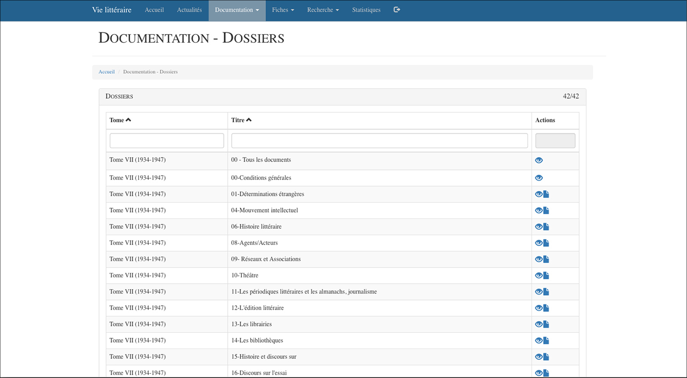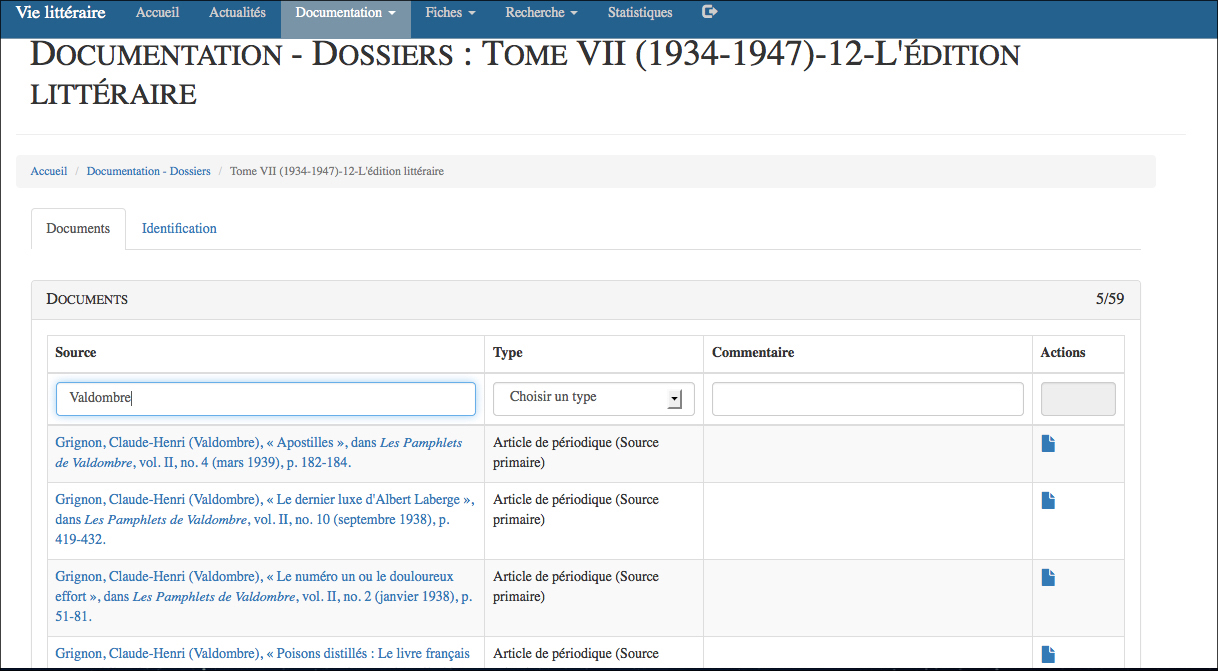 Les principales composantes de notre base sont regroupées sous les onglets « Documentation » et « Fiches », lesquels se trouvent à l’origine des tomes de La Vie littéraire comme au fondement du développement de notre écosystème numérique3.