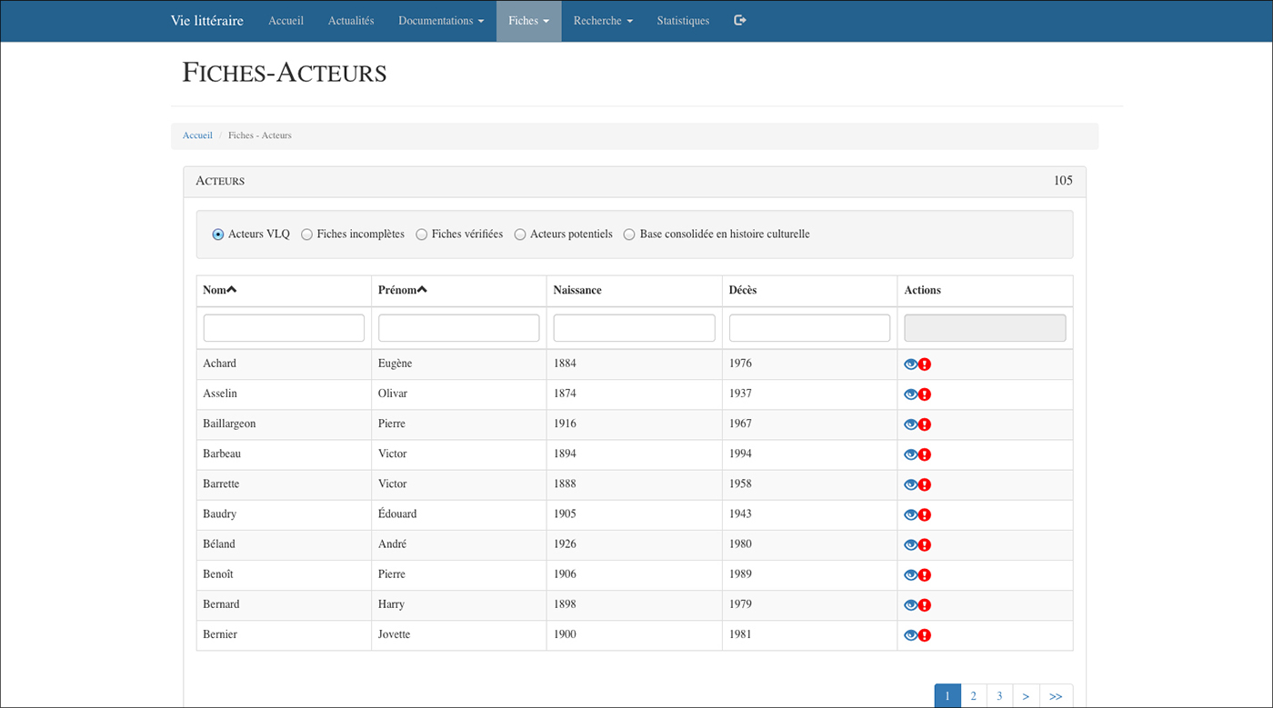 Constituant le cœur de la base VLQ, l’espace « Fiches » contient, quant à lui, une vaste quantité d’informations concernant cinq types d’objets liés d’une façon ou d’une autre à la vie littéraire : les acteurs, les associations, les organismes, les lieux et les périodiques. Ici, il ne s’agit plus uniquement de documents numérisés, mais bien plutôt de données structurées.