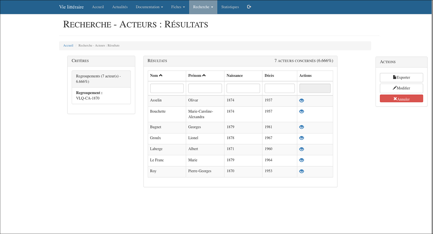 Le champ « Regroupements », notamment, permet ainsi la création rapide, à des fins d’analyse, de sous-corpus d’acteurs, Asselin étant assigné au regroupement « VLQ-CA-1870 », qui réunit tous les acteurs nés entre 1870 et 1879. En l’état actuel, notre base permet donc d’établir, de manière automatique, des trajectoires communes et des réseaux d’acteurs, de déterminer les publications par genre et par génération, ce qui représente une avancée majeure par rapport aux fiches initiales, qui ne permettaient de telles opérations qu’au terme de longues démarches artisanales, coûteuses en temps aussi bien qu’en ressources.