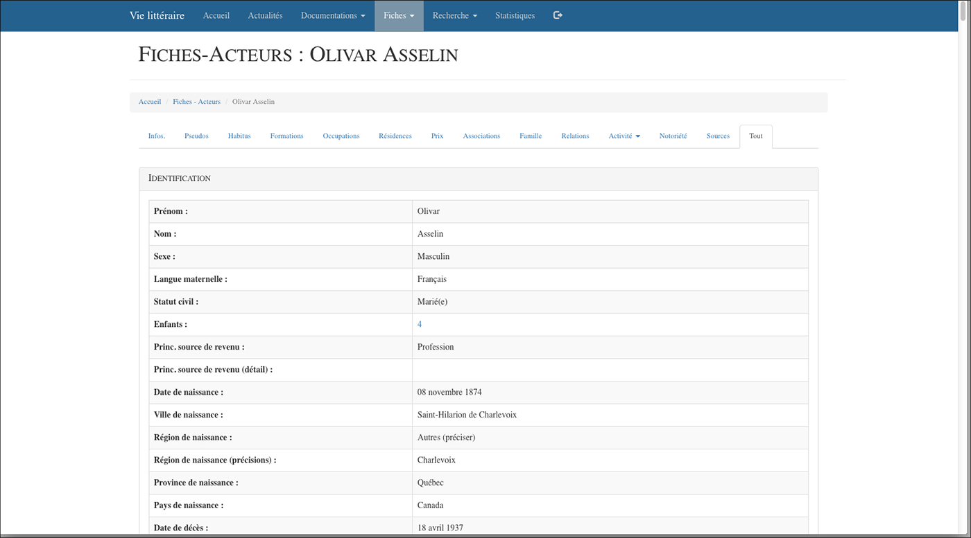 Au fil du temps, les fiches « Acteurs », visant à concevoir des échantillonnages8 sous forme de tableaux publiés dans les tomes, ont elles-mêmes évolué. En effet, si les principales catégories contenues dans les fiches papier originales (année de naissance et de décès, formation, occupations principales, publications, etc.), ont été répercutées dans nos fiches électroniques, certaines ont également été ajoutées afin de faciliter le recensement de nouvelles informations ou de nouvelles pistes à suivre (tels différents marqueurs de l’habitus et de la notoriété, le répertoire des groupes ou des lieux fréquentés par un acteur, ainsi que sa mention, ou non, dans les principales histoires littéraires du xxe siècle). En somme, il s’agit d’intégrer, à même les fiches, la possibilité de multiplier les requêtes, de les croiser, dans la perspective d’en élargir autant que d’en affiner les possibilités sur le plan statistique. Le tout pouvant bien sûr s’appliquer soit à la lecture générale de la période dans sa globalité, soit à un ensemble de données circonscrites (génération, genre littéraire, lieu d’activité, origine sociale, etc.). Si l’on compare, par exemple, la version papier de la fiche d’Olivar Asselin à sa version virtuelle, on constate que la seconde est en grande partie une reproduction de l’originale, mais que s’y ajoutent des informations conçues spécifiquement en vue de maximiser l’utilisation des outils de recherche et le repérage de corrélations jusque-là inédites.