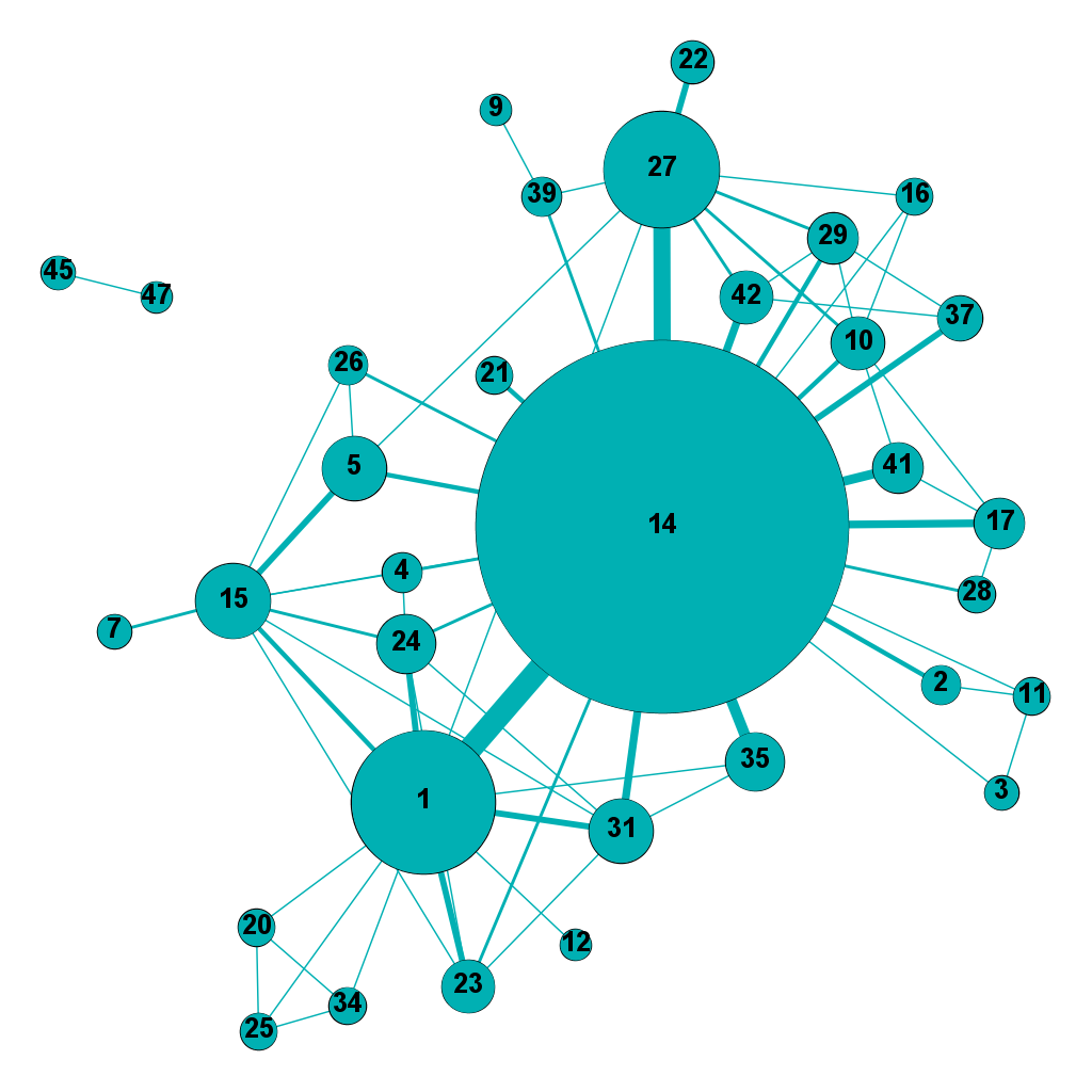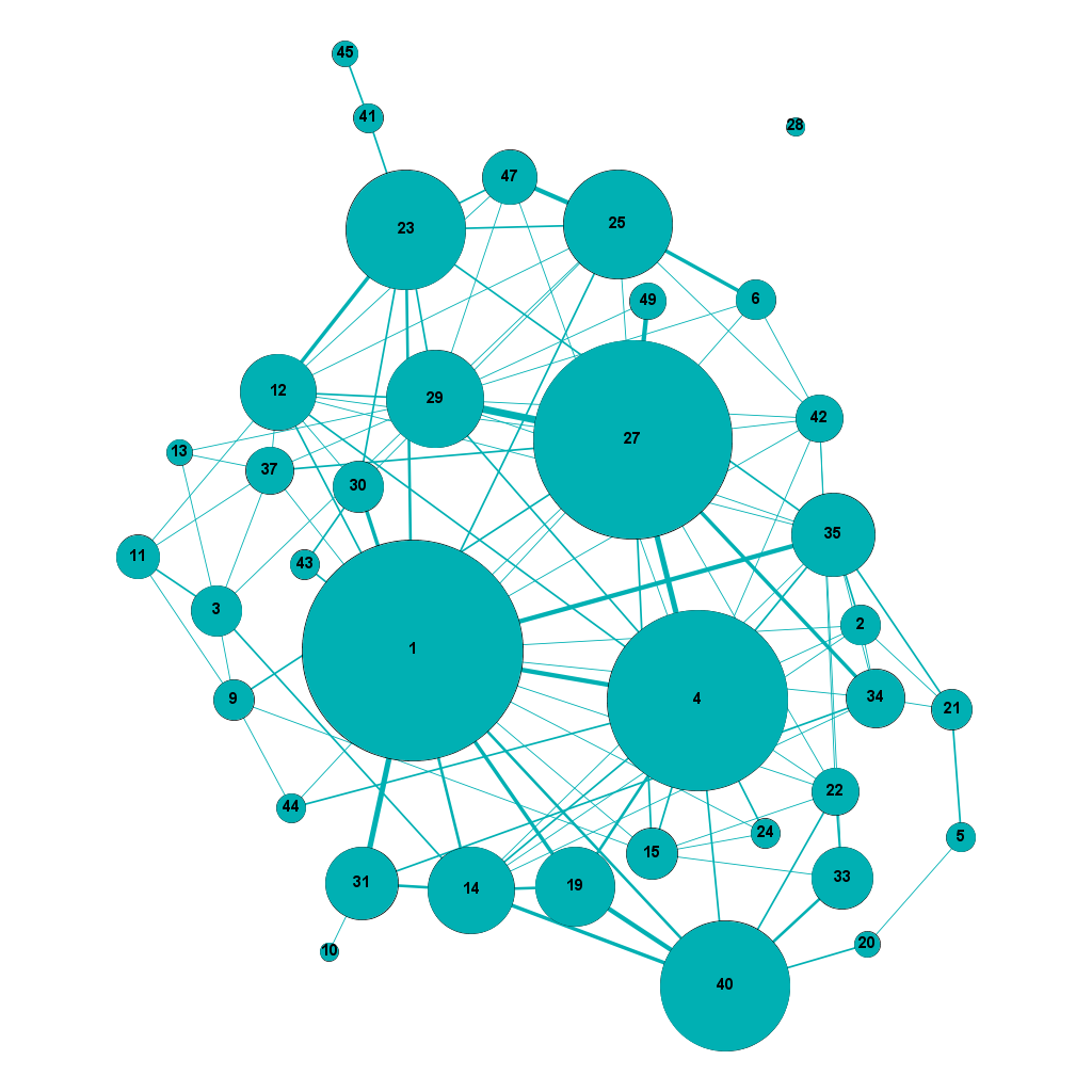 12 The graphs only feature 39 nodes—not 42, the number of networks which have hosted presentations of papers on art and culture—, as in RT18, RT33 and