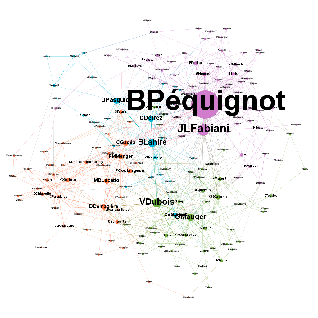 34 In order to make these graphs more readable, we excluded panel members with only one appearance; therefore, they do not contribute to structuring the network. Additionally, one obviously needs to be a member of a panel for at least two individuals to be taken into account, meaning that in cases where only the PhD supervisor is known (especially frequent for PhD candidates, except those with two supervisors), they do not contribute to structuring the network. The size of nodes is proportional to their betweenness centrality index. The colours of nodes and ties depend on their modularity class.