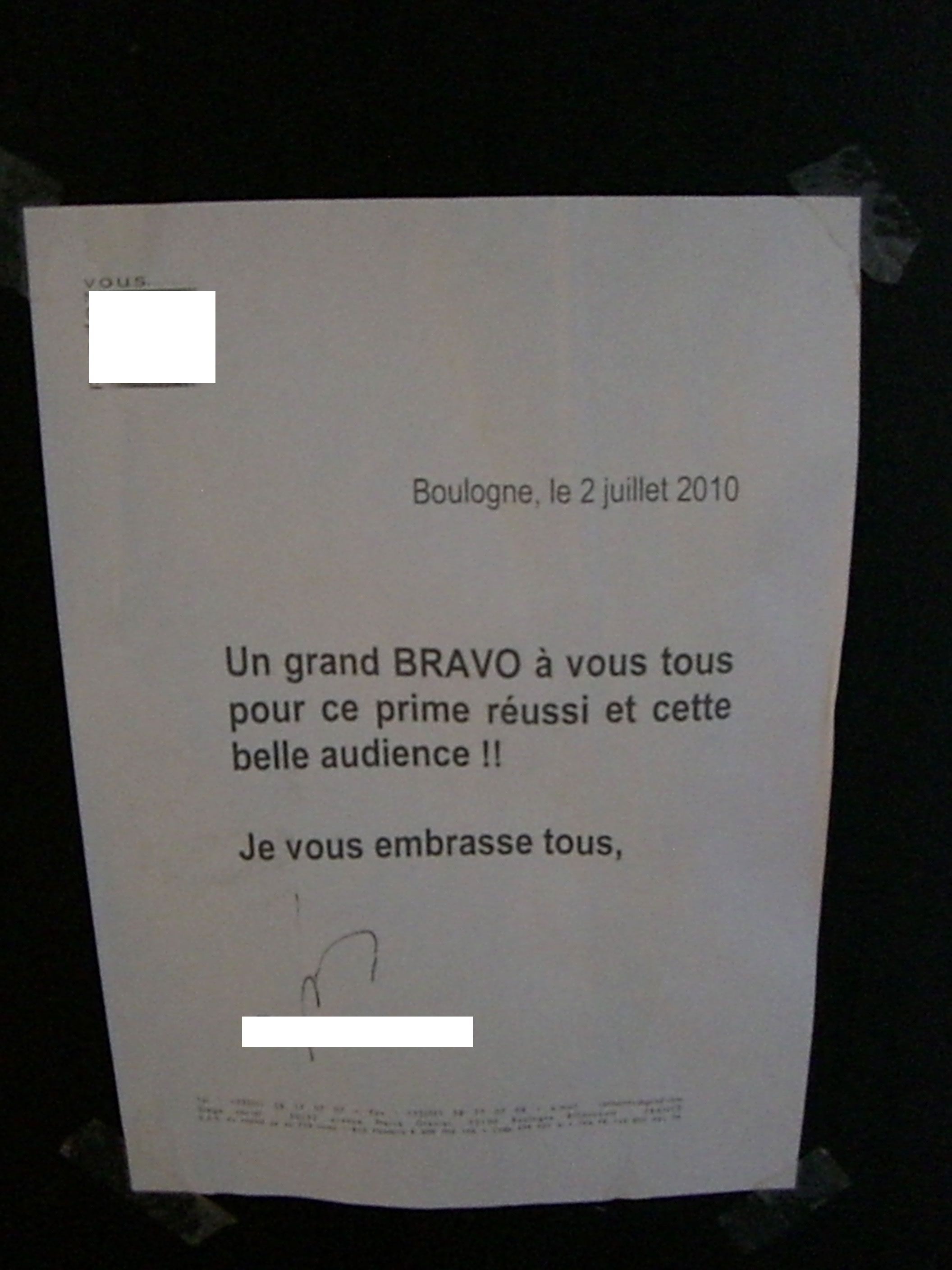 Fig. 2. Un mot du producteur après de bonnes audiences, affiché dans les studios de Plus belle la vie, août 2010