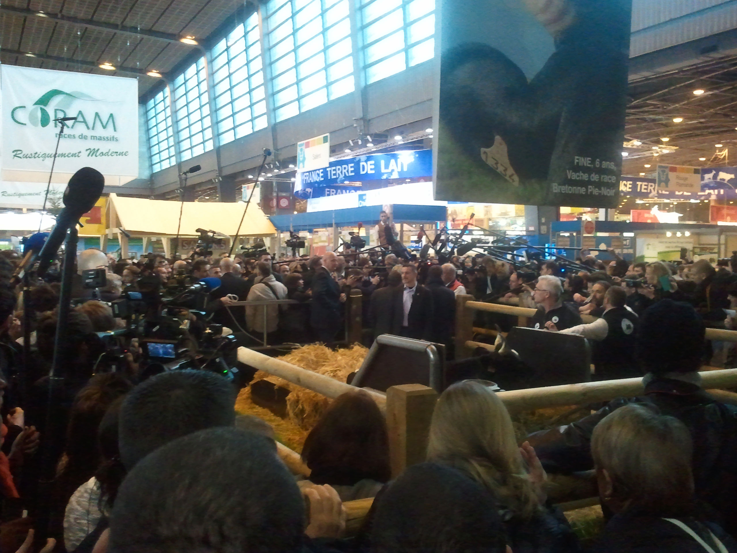Les visites politiques au Salon de l’agriculture, réussite de la profession agricole et des pouvoirs publics, mobilisent chaque année un nombre important de journalistes, surtout en période électorale. Ils ne sont pas les seuls à accompagner les politiques. On trouve aussi des soutiens, qu’ils ou elles soient élu·e·s ou non, des assistant·e·s, des communicant·e·s, ainsi que quelques militant·e·s qui, au Salon, tendent à rester discrets. Enfin, il y a le public qui cherche à se rapprocher des personnalités : il est encadré par les services de sécurité (publics et privés) et ceux du protocole, chargés de maintenir un espace autours des politiques tout en permettant aux médias d’être proches et de pouvoir travailler. Les visites sont donc le résultat d’une construction collective et sont fortement codifiées : elles constituent ainsi une sorte de rituel.
