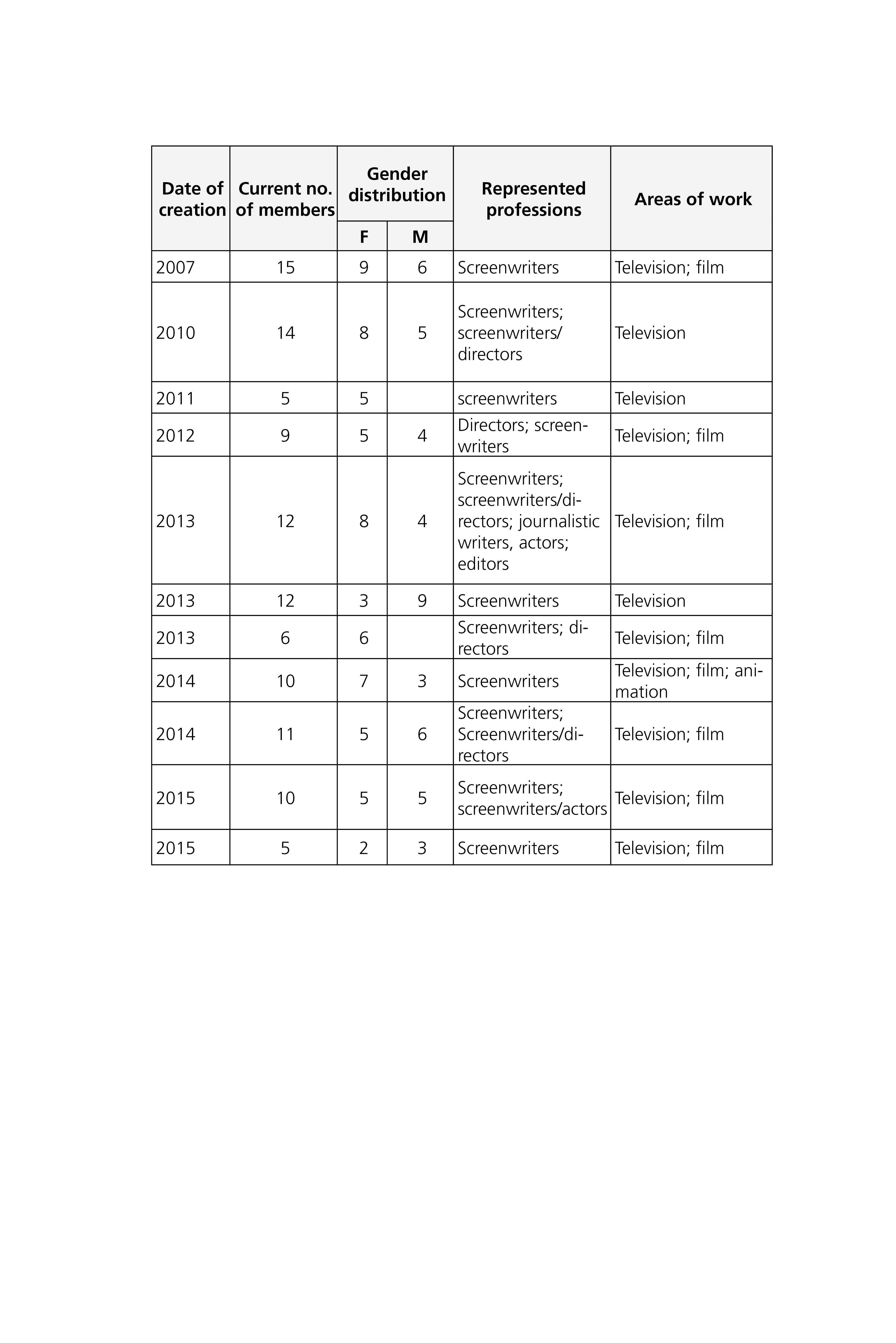 However, the collectives differ from one another in one key aspect: while all of them present themselves as “screenwriters’ collectives,” their membership does not only include television writers. Some of their members write for a variety of media and formats (graphic novels, animation, film, radio, theatre) and others are directors or editors8 (see table 2). It is also worth noting that among the collectives under study here, most are mixed-gender, but two are open exclusively to women.