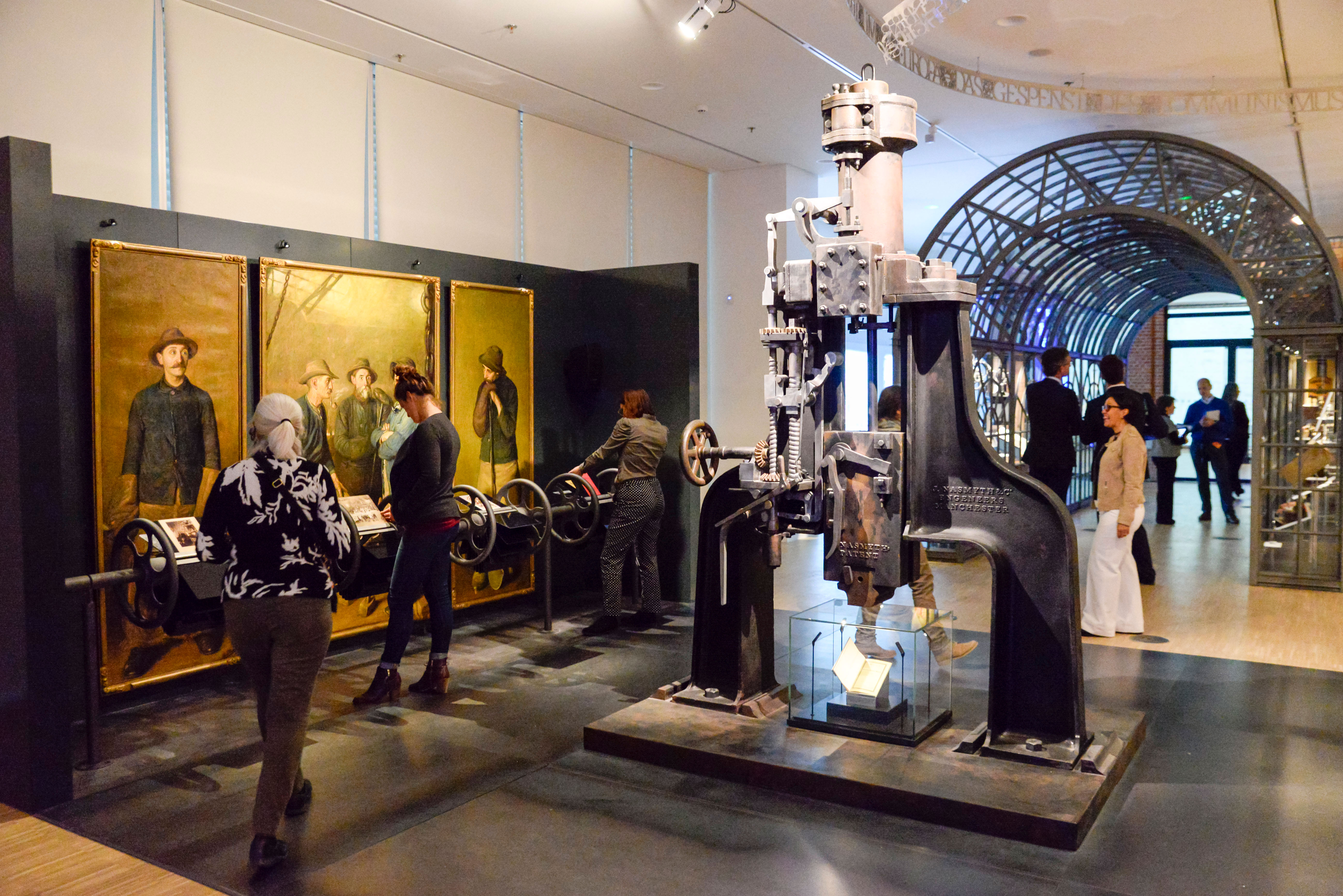 D’entrée de jeu, l’adresse au public de l’exposition se veut claire : « Les différents thèmes ne sont pas organisés en fonction des frontières nationales. Ils correspondent plutôt aux principaux processus et phénomènes qui ont divisé et uni les Européens à travers le temps » (Maison de l’histoire européenne 2017 : 4). Généralement, cette approche surprend et séduit, ce qui montre peut-être, a contrario, que les visiteur·euse·s de musées sont encore conditionné·e·s par le paradigme national. Différents dispositifs expositionnels sont mis à l’œuvre pour construire ce récit transnational. Il peut s’agir par exemple de choisir un objet ou une œuvre emblématique qui représente à elle seule un élément important du récit, comme la copie du marteau-pilon anglais Nasmyth (original, vers 1850, conservé au Science Museum de Londres) qui symbolise la révolution industrielle. Mais il peut s’agir aussi d’ensembles d’objets ou de documents de différentes origines, qui montrent comment un phénomène s’est décliné sous différentes formes à travers tout le continent, comme l’illustrent par exemple les versions française, allemandes (deux différentes), néerlandaise, italienne et polonaise du Code civil napoléonien exposées dans la vitrine sur les changements politiques du xixe siècle. Comme le remarque Jakub Jareš :