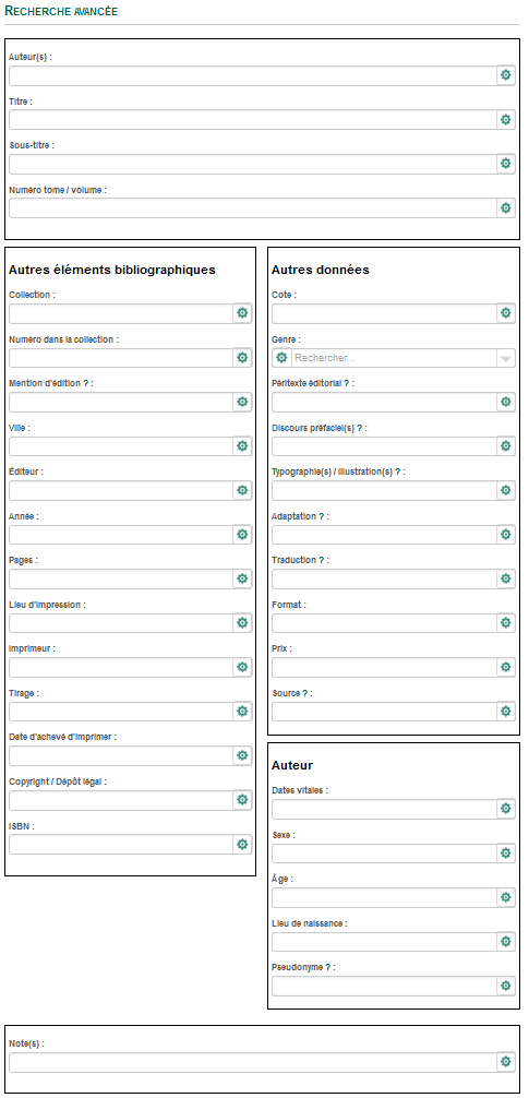 It was then that the decision was made to no longer use File Maker and to change over to MySQL. Most of the documentary databases, that is, the indexes, bibliographies, and references, were thus converted and made available online. In the case of publishers’ catalogues, a revision and standardization project was undertaken, but could not be completed due to a lack of resources. The most complete catalogues as well as those considered to be the most pertinent for research were nonetheless transferred, despite their gaps and any errors they might contain. A clear benefit is the fact that it is now possible to search all catalogues simultaneously and even integrate all databases into one search in order to cross-reference the results.